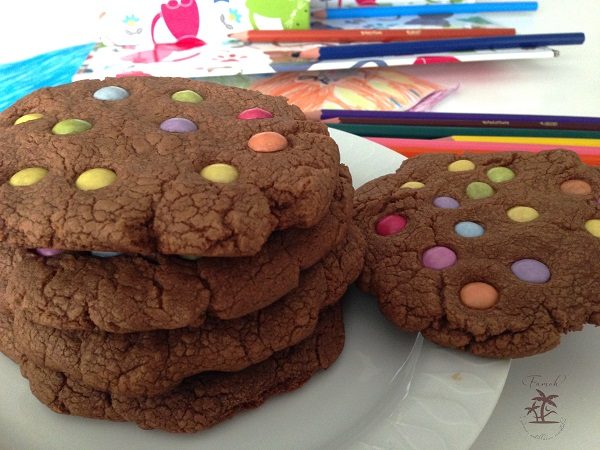 Les vacances scolaires sont quand même pour moi synonyme de plaisirs culinaires pour mes enfants et j’ai eu envie de préparer des cookies chocolat agrémentés de Smarties.