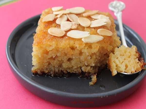 Dès la sortie du four, arroser votre gâteau avec le sirop, décorer d’amandes effilées et laisser reposer pendant 2 heures.