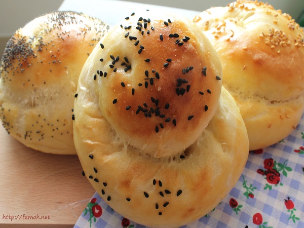 Badigeonner chaque pain au yaourt avec du jaune d’œuf et parsemer de graine de sésames, de pavot et de nigels.