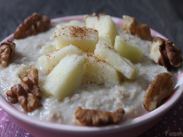 Porridge au lait d’amande, pommes et noix très gourmand.